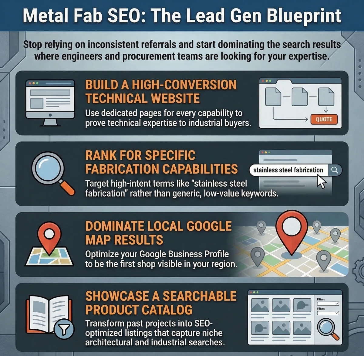 The visual example below illustrates the core elements of a successful metal fabrication SEO strategy, including website structure, capability-based search optimization, local search visibility, and product catalogue content that helps attract high-intent buyers searching for specific metal fabrication solutions.